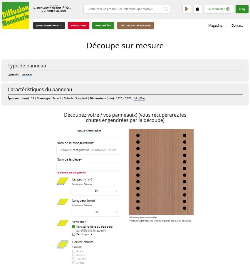 J'ai travaillé à simplifier l'expérience utilisateur, en permettant aux clients de personnaliser facilement leurs panneaux (type de bois, dimensions, coloris, finition) et de choisir entre une découpe simple ou sur mesure avec options de finition et perçage. J'ai également veillé à ce que l'information sur les délais de livraison et la récupération en magasin soit claire, afin d'optimiser la conversion et la satisfaction client.