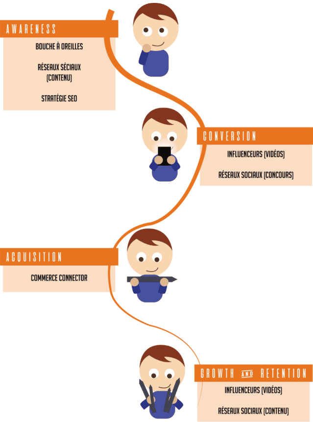 Ce schéma indique comment la cible se comporte lorsqu'elle découvre Pentel. On s'assure ainsi que le parcours soit optimal et pratique, de manière à ce que le client n'oublie pas notre marque.
